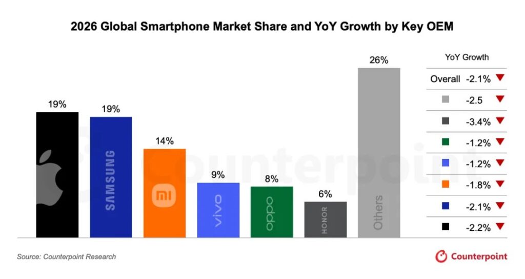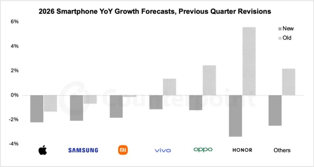此次 2.1% 的年减幅度,相当于 Counterpoint Research 将 2026 年出货预测下修 2.6 个百分点。其中,HONOR、OPPO 与 vivo 等中国 OEM 与先前预估相比,修正幅度较为显著。